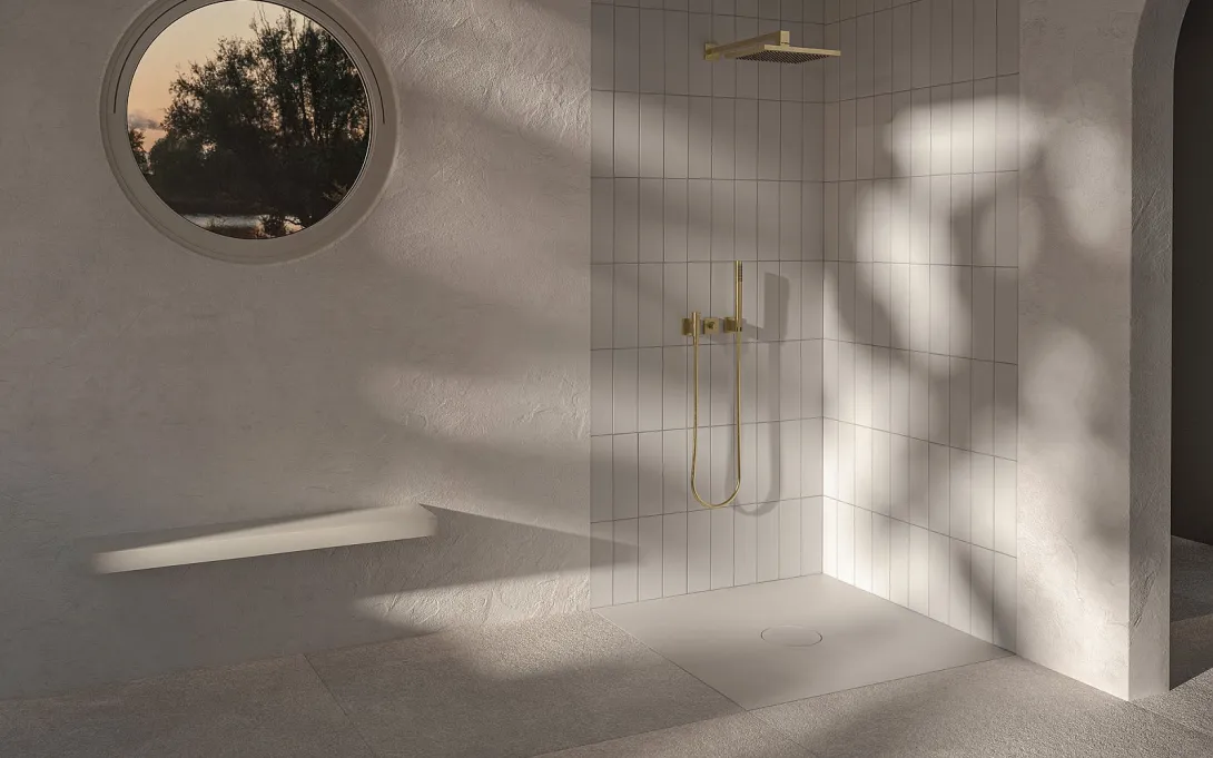 Bodenebene Duschfliese BetteAir in Weiß mit goldener Duscharmatur.