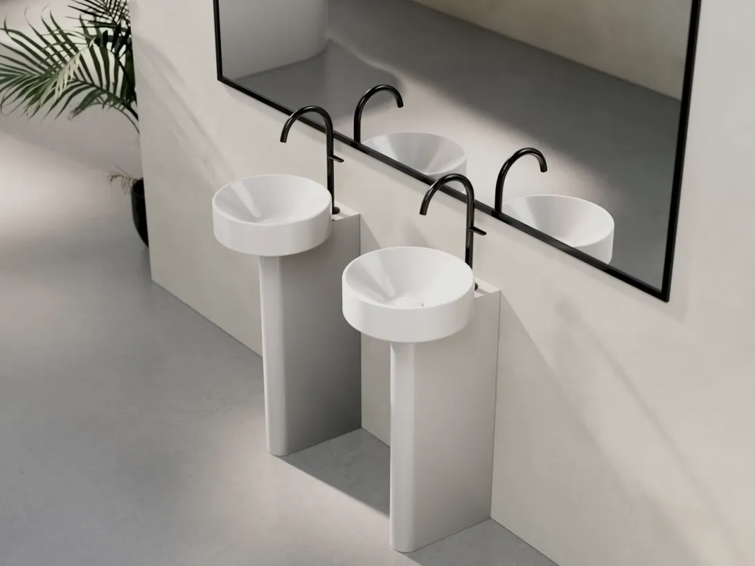 Der bodenstehende Waschtisch der BetteSuno-Kollektion, entworfen von Barber Osgerby, beeindruckt mit seiner reduzierten Ästhetik und fügt sich wie eine zeitlose Skulptur harmonisch in das Badambiente ein.