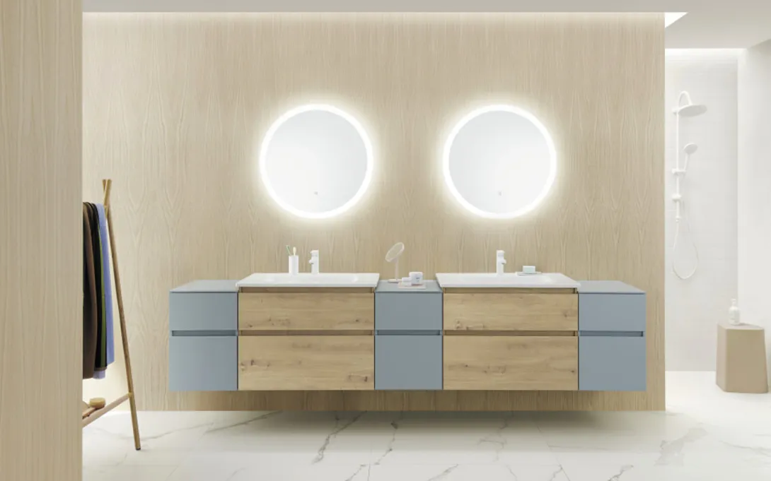Der Lin20-Spiegelschrank ist in sechs Breiten (von 600 mm bis 1600 mm) erhältlich. Eine Horizontalleuchte mit Dimmfunktion liefert blendfreies Licht, bei dem zwischen kalt- und warmweißen Tönen reguliert werden kann. Das Besondere: Auch die Innenraum- und indirekte Deckenbeleuchtung wird über die horizontale LED-Leuchte erzielt. Somit läuft das komplette Beleuchtungskonzept über ein und dasselbe Licht – eine absolute Neuheit. Beidseitig verspiegelte Türen, Vergrößerungsspiegel, Schalter/Steckdosen, eine optionale Waschtischbeleuchtung und Einlegeböden aus Glas veredeln die komfortablen Schränke (700 mm Höhe, 160 mm Tiefe).
