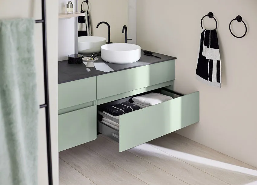Eine sys30 Badezimmereinrichtung mit einem weißen Aufsatzwaschtisch auf einer Steinplatte und einer darunter geöffneten Schublade.