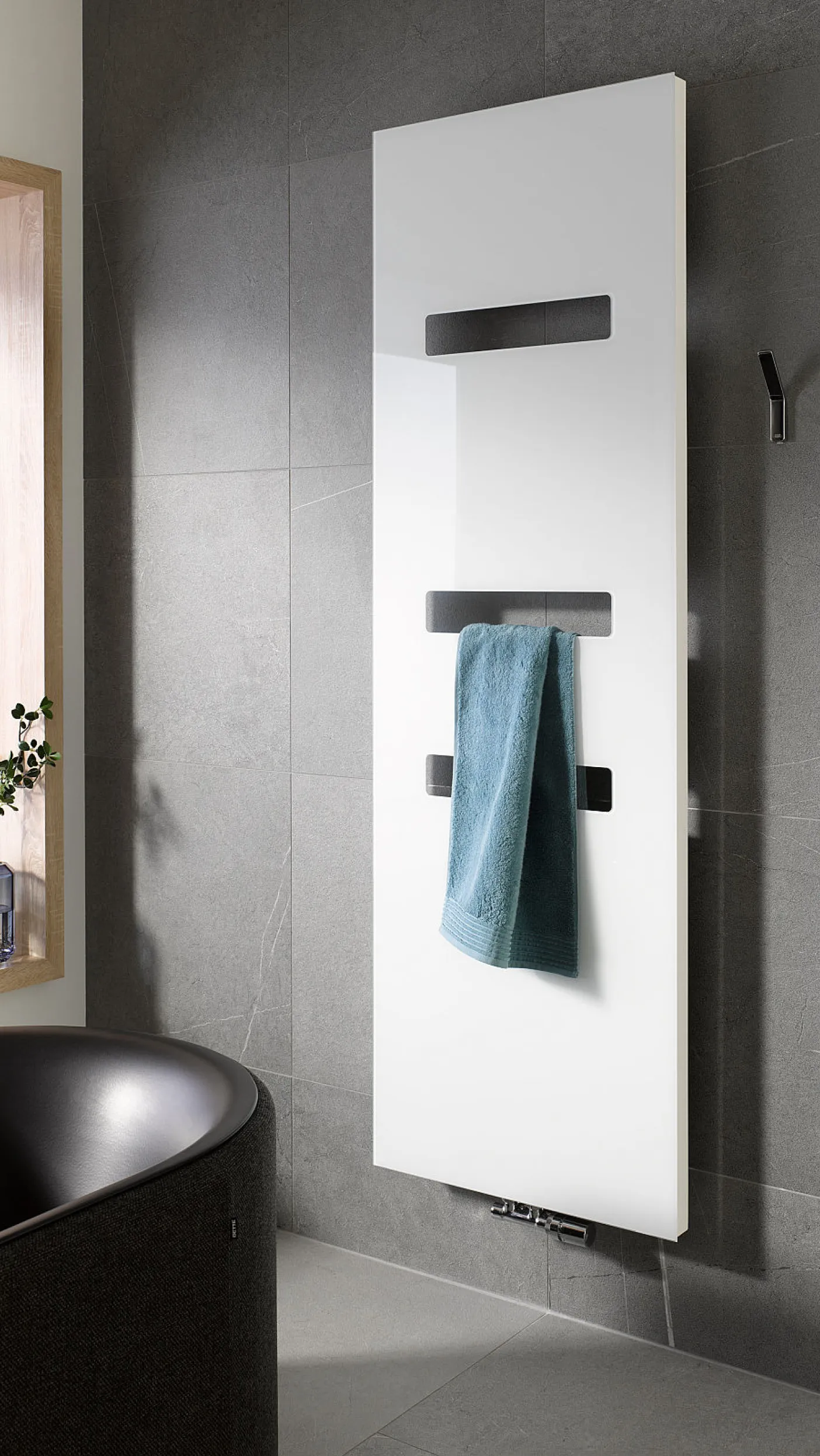 Den Designheizkörper Yenga gibt es jetzt auch als Plus-Modell. Er verfügt über herausstehende Heizlamellen, die das Aufhängen und Vorwärmen von Handtüchern ermöglichen. Sein markanter Look macht ihn zu einem echten Design-Element. Mit zwei unterschiedlichen Größen passt er in jedes Badezimmer und rundet so Ihr Wohlfühlerlebnis perfekt ab.
