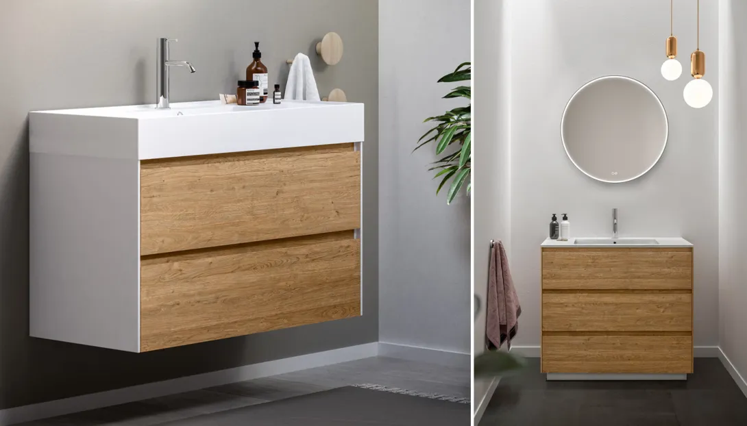 #46 steht für ein durchdachtes Design, das Qualität auf den Punkt bringt. Die optimierte Tiefe der Schränke eignet sich ideal für mittelgroße Badezimmer und bietet zugleich Stabilität und großzügigen Stauraum.
