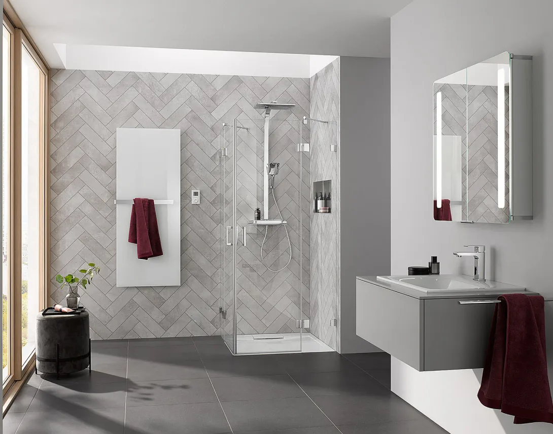 Die großformatigen Platten von RenoDeco sind vielseitig einsetzbar und erzeugen ein einheitliches und modernes Badezimmer-Ambiente. Dabei sind sie auch äußerst praktisch: So lassen sich z.B. unvollständige Wände abdecken, um sie zu verschönern und zeitgleich vor Spritz- und Kondenswasser zu schützen.